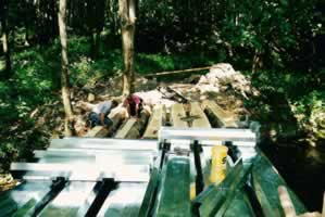 Die fertig verlegten Längsträger werden nun mit Alu-Blechen als konstruktiven Holzschutz versehen. Dies erhöht die Lebensdauer der Hauptträger.