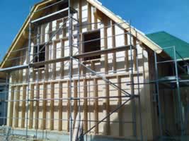 Hier kann man die Holzrahmenbauweise für die Niedrigenergiehäuser erkennen. Durch eine Vielzahl von Möglichkeiten der Eigenleistung kann man die Baukosten selbst vergleichsweise niedrig halten.